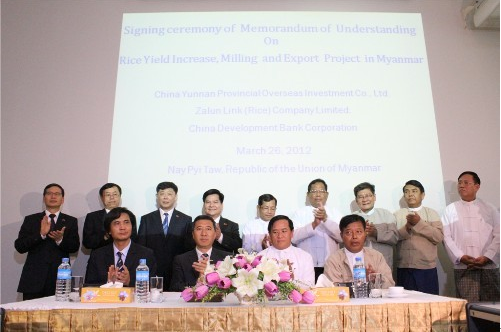 2012年3月26日上午,緬甸大米增產(chǎn)加工出口項目簽約儀式在緬甸首都內(nèi)比都舉行。云南建工集團公司董事長、云南省海外投資有限公司董事長納杰,國家開發(fā)銀行云南省分行副行長鐘書俊,緬甸農(nóng)業(yè)灌溉部農(nóng)務(wù)司司長吳覺溫,緬甸扎隆林克有限公司總經(jīng)理吳通營四方共同簽署《緬甸大米增產(chǎn)加工出口項目合作諒解備忘錄》。