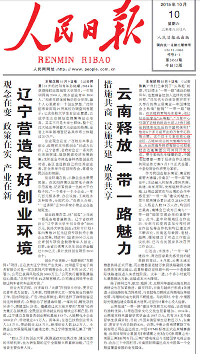 今日,人民日報以雙頭條的形式刊發(fā)了《觀念在變 政策在實 產業(yè)在新——遼寧營造良好創(chuàng)業(yè)環(huán)境》和《措施共商 設施共建 成果共享——云南釋放一帶一路魅力》兩篇報道,在《措施共商 設施共建 成果共享——云南釋放一帶一路魅力》一文中,對萬象中心的具體情況和作用地位作了報道。