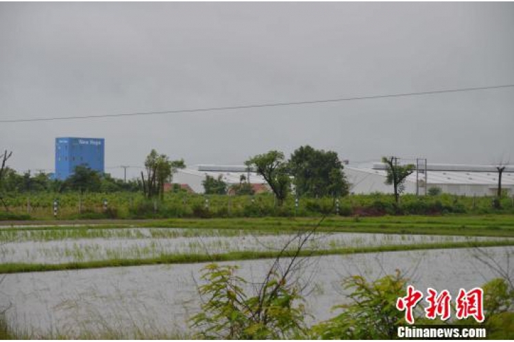 道路兩旁,是一望無際被雨水浸泡的稻田,數(shù)個村莊散落其中。一群鴨子從稻田里“晃悠”上柏油路,一名赤腳男孩細雨中尾隨。不遠處,一棟棟白色巨大廠房與老撾的傳統(tǒng)農(nóng)業(yè)對比鮮明。