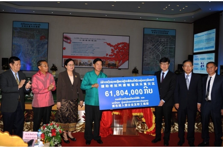揭牌儀式上,馬德和李亞東分別代表云南建投集團和招商局慈善基金會、開發(fā)區(qū)入園企業(yè)向老撾阿速坡省洪水重災(zāi)區(qū)的受災(zāi)群眾進行捐款,萬象市市長辛拉馮·庫派吞先生代表災(zāi)區(qū)群眾接受捐贈并表示感謝。