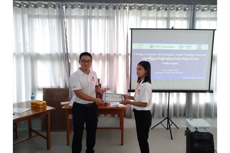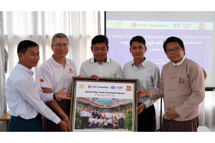 馬傳福代表中信聯(lián)合體在結(jié)業(yè)儀式致辭中表示,此次培訓項目是中信聯(lián)合體在緬甸開展的第4個公益項目,旨在通過我們的努力為推動皎漂以及緬甸社會民生發(fā)展做出貢獻,未來中信聯(lián)合體將會基于本地需求,繼續(xù)開展培訓項目,支持皎漂的基礎(chǔ)教育和職業(yè)教育事業(yè)發(fā)展。在儀式上,馬傳福、吳尼尼和其他代表向?qū)W員頒發(fā)了結(jié)業(yè)證書,并向項目管委會贈送了紀念品。