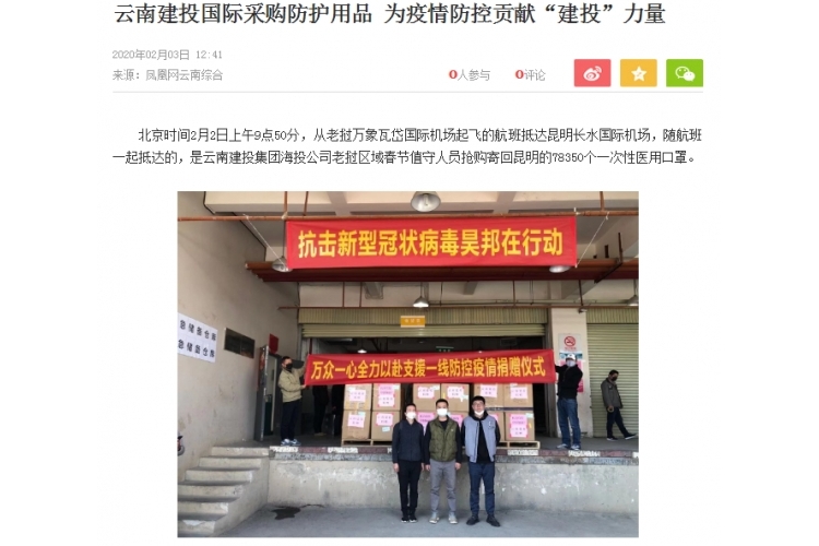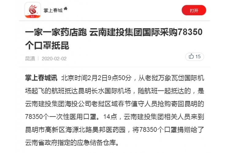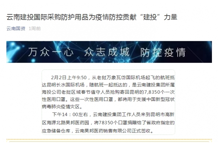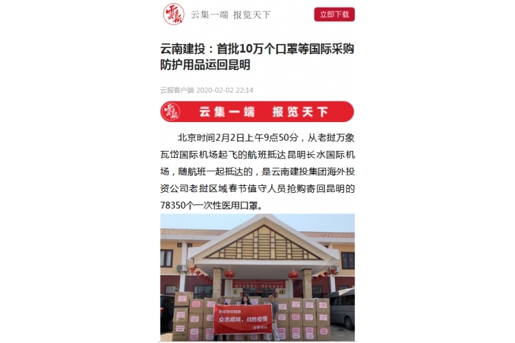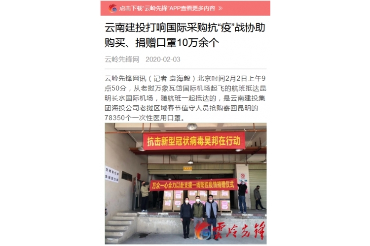 連日來(lái),武漢新型冠狀病毒肺炎疫情牽動(dòng)著全國(guó)人民的心。云南建投集團(tuán)立即行動(dòng),發(fā)揮駐外機(jī)構(gòu)優(yōu)勢(shì),整合優(yōu)勢(shì)資源,通過(guò)多種渠道,從越南、緬甸、印度、老撾等國(guó)家購(gòu)買防護(hù)用品,一場(chǎng)國(guó)際采購(gòu)、國(guó)際馳援的抗“疫”戰(zhàn),在云南建投集團(tuán)上下持續(xù)打響。2月2日下午14:00左右,云南建投集團(tuán)相關(guān)人員來(lái)到昆明市高新區(qū)海源北路昊邦醫(yī)藥園,將78350個(gè)口罩捐贈(zèng)給了省政府指定的應(yīng)急儲(chǔ)備倉(cāng)庫(kù),云南昊邦醫(yī)藥銷售有限公司正式簽收。