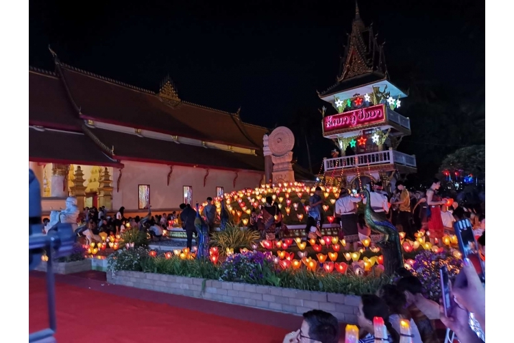 快晚上8點(diǎn),我們來到村部操場。舞臺(tái)的音樂震得人心臟呯呯跳,不得不佩服老撾人練就的強(qiáng)大心臟。舞臺(tái)下擺了好多桌子,供大家喝啤酒用,周圍如趕集般熱鬧,到處是小商小販。我到周邊轉(zhuǎn)了轉(zhuǎn),發(fā)現(xiàn)村部其實(shí)就是一個(gè)廟宇,操場邊上一個(gè)好大的寺廟金碧輝煌,應(yīng)該是全村最漂亮最好的建筑。進(jìn)寺廟大廳需要脫鞋,中間有幾個(gè)人好像是在做祈禱。