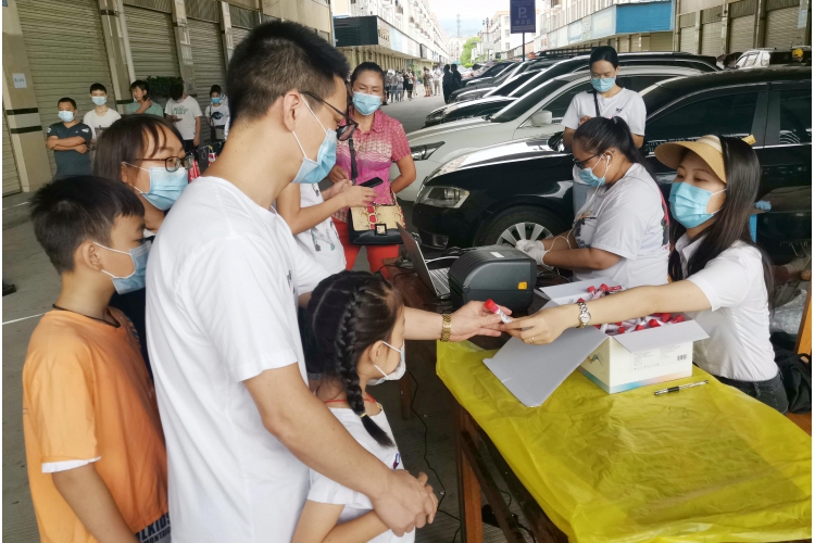 活動(dòng)現(xiàn)場(chǎng),支部全體黨員佩戴黨徽,耐心地向參與核酸檢測(cè)的社區(qū)居民解讀采樣流程,引導(dǎo)居民掃碼登記個(gè)人信息,維護(hù)好現(xiàn)場(chǎng)秩序,高效完成采樣。活動(dòng)全天,瑞麗跨投黨支部共協(xié)助完成采樣2035人次。